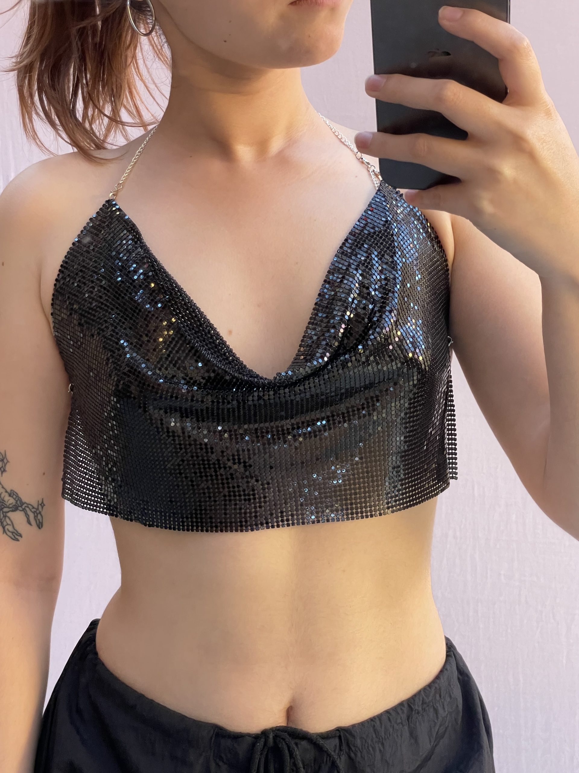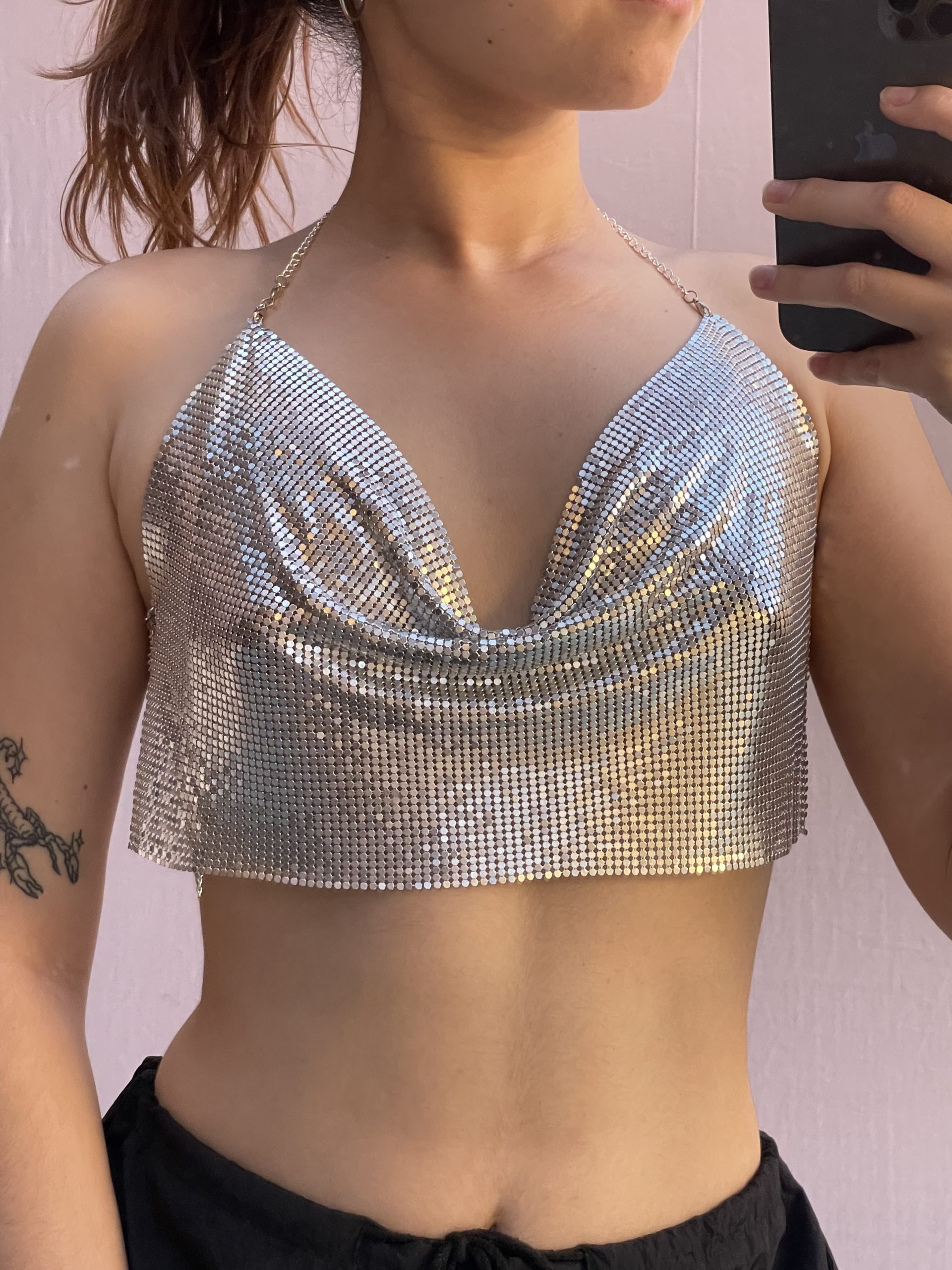 El metalizado es tendencia hoy, con espalda descubierta y sus tirantes de cadena que armonizan aún más.